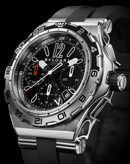 Altrettanto "impattante" è il Bulgari Diagono , che in versione X-Pro consta delle funzioni cronografiche e di tre fusioni orarie (il secondo è una lancetta su 24 ore e il terzo fuso è individuabile attraverso l'esterno ghiera). La cassa abbina acciaio e titanio, mentre la movimento è l'automatico calibro BVL 312 (base Valjoux 7750 con modulo GMT). Anch'esso è certificato dal COSC.